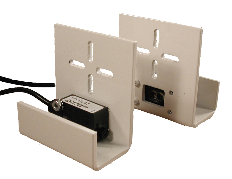 The BLU-IR is a light source-receiver pair of photoelectric sensors used to turn on speakers in an adjacent room when a sliding door between the rooms is opened. The sensors are mounted on heavy duty aluminum brackets. Both the Emitter and Receiver cables end in pigtail wires.