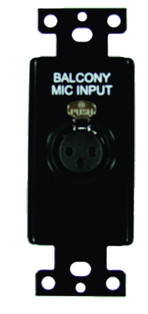 The CP1 series of panels are made to be mounted in the sound rack for routing audio and video signals in a building. The CP1-BM panel features a female XLR connection for accessing a balcony mic audio signal at the rack. The CP1-BM module is available in black only, with a white silkscreened legend.