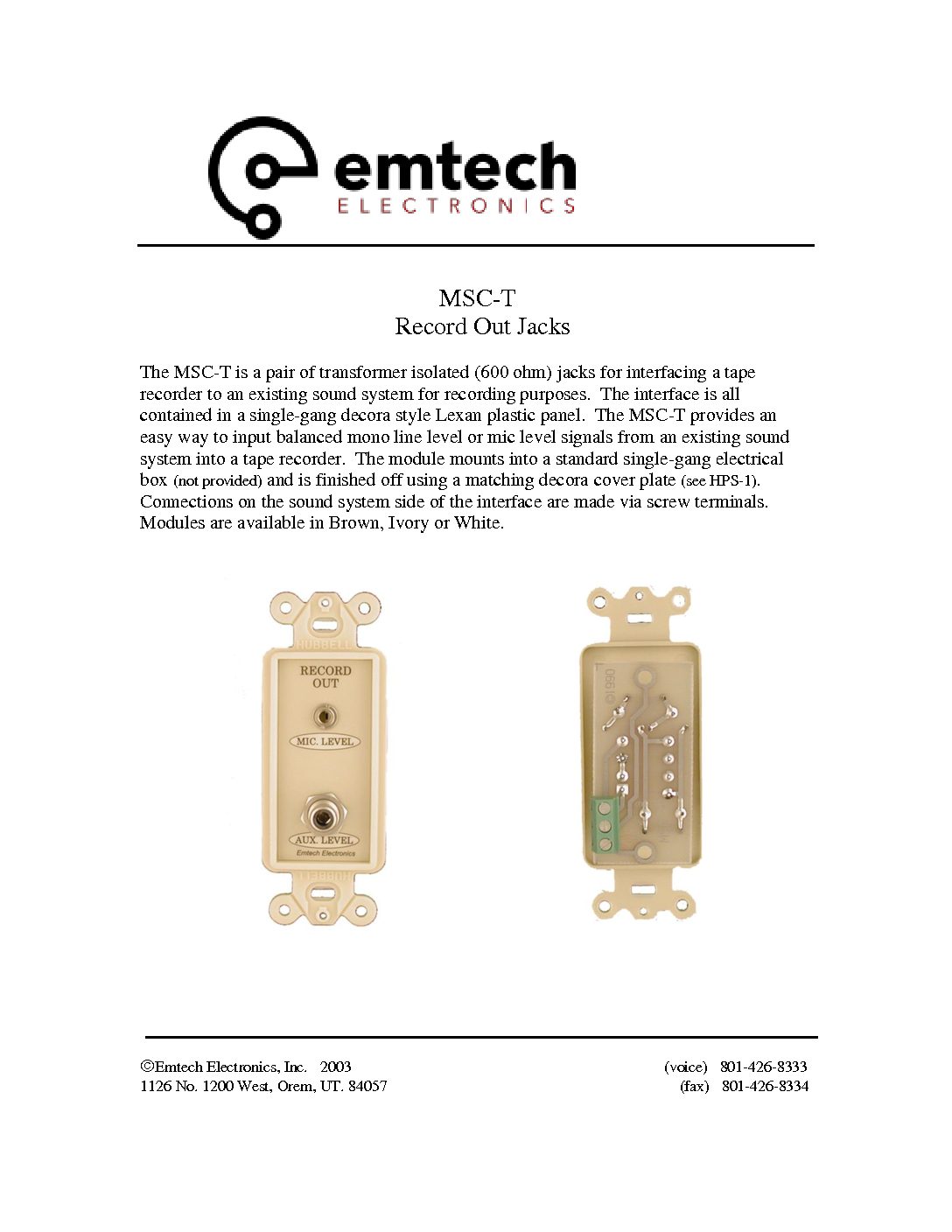 The MSC-T is a pair of transformer isolated (600 ohm) jacks for interfacing a tape recorder to an existing sound system for recording purposes. The interface is all contained in a single-gang decora style Lexan plastic panel. The MSC-T provides an easy way to input balanced mono line level or mic level signals from an existing sound system into a tape recorder. The module mounts into a standard single-gang electrical box (not provided) and is finished off using a matching decora cover plate (see HPS-1). Connections on the sound system side of the interface are made via screw terminals. Modules are available in Brown, Ivory or White.