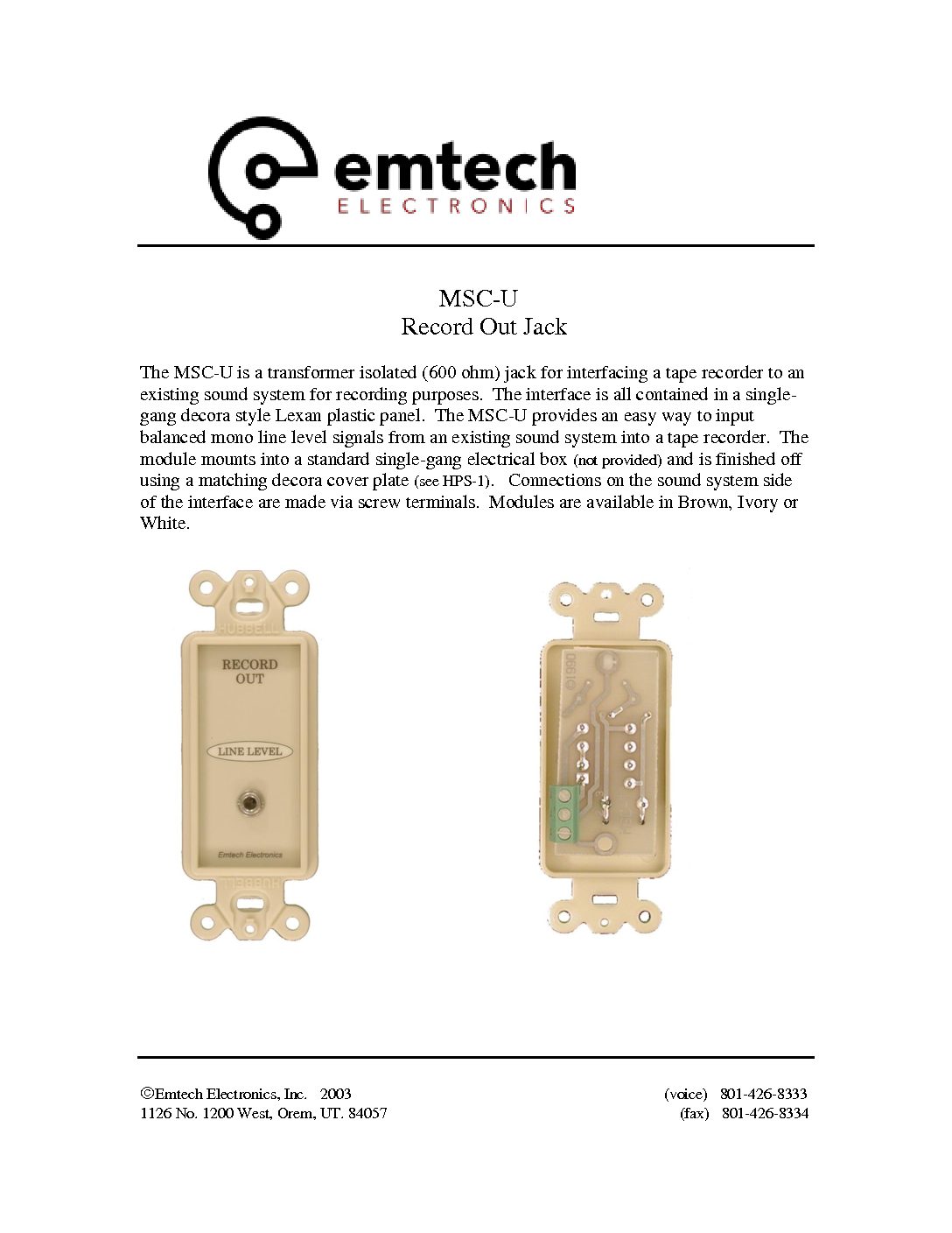existing sound system for recording purposes. The interface is all contained in a single-gang decora style Lexan plastic panel. The MSC-U provides an easy way to input balanced mono line level signals from an existing sound system into a tape recorder. The module mounts into a standard single-gang electrical box (not provided) and is finished off using a matching decora cover plate (see HPS-1). Connections on the sound system side of the interface are made via screw terminals. Modules are available in Brown, Ivory or White.