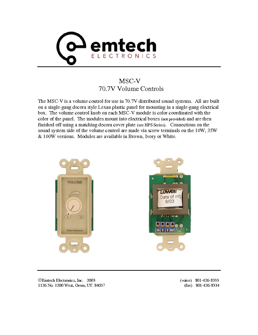 The MSC-V is a volume control for use in 70.7V distributed sound systems. All are built on a single-gang decora style Lexan plastic panel for mounting in a single-gang electrical box. The volume control knob on each MSC-V module is color coordinated with the color of the panel. The modules mount into electrical boxes (not provided) and are then finished off using a matching decora cover plate (see HPS Series). Connections on the sound system side of the volume control are made via screw terminals on the 10W, 35W & 100W versions. Modules are available in Brown, Ivory or White.