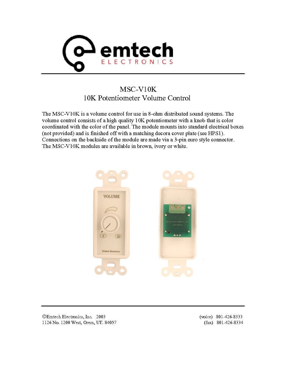 The MSC-V10K is a volume control for use in 8-ohm distributed sound systems. The volume control consists of a high quality 10K potentiometer with a knob that is color coordinated with the color of the panel. The module mounts into standard electrical boxes (not provided) and is finished off with a matching decora cover plate (see HPS1). Connections on the backside of the module are made via a 3-pin euro style connector. The MSC-V10K modules are available in brown, ivory or white.