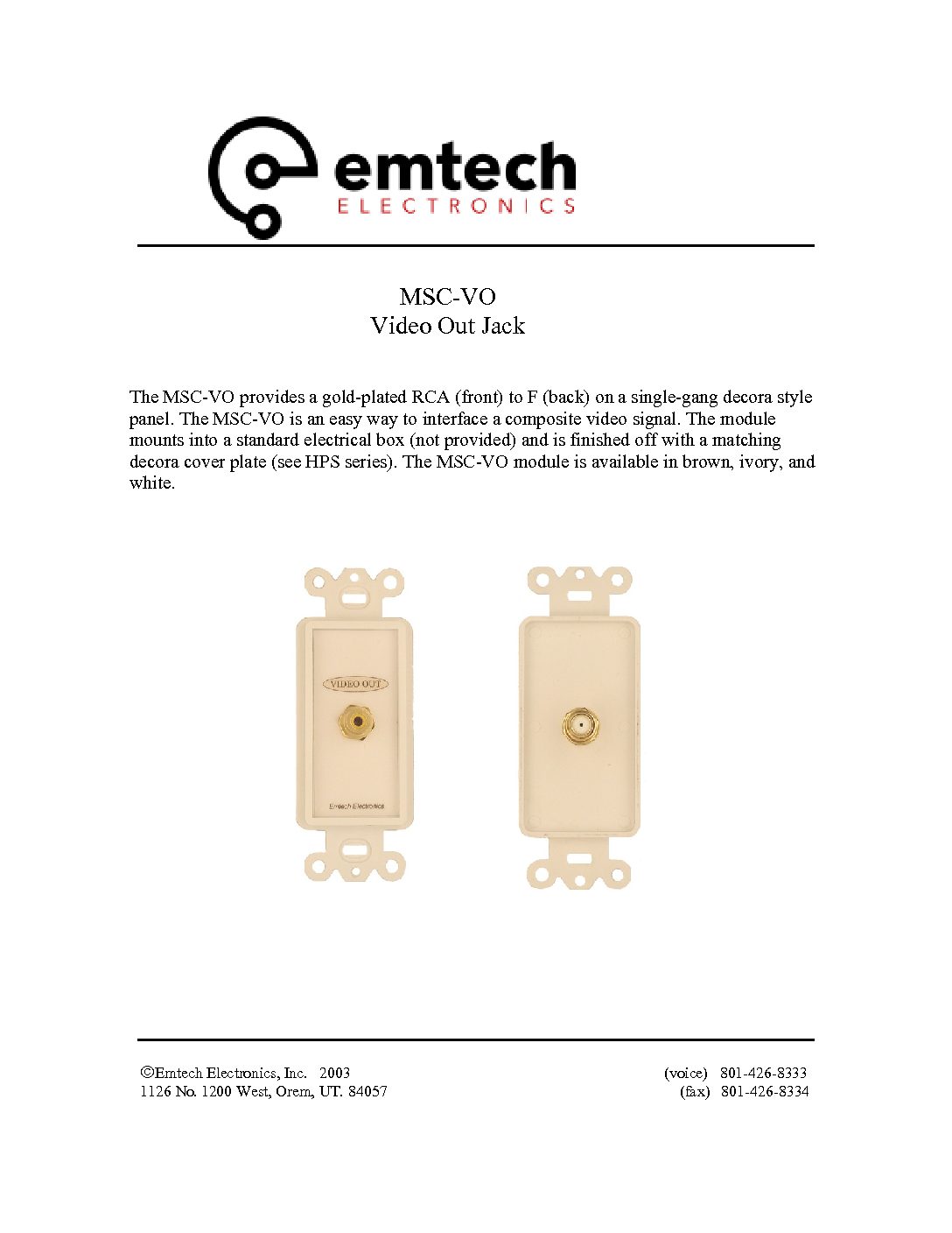 The MSC-VO provides a gold-plated RCA (front) to F (back) on a single-gang decora style panel. The MSC-VO is an easy way to interface a composite video signal. The module mounts into a standard electrical box (not provided) and is finished off with a matching decora cover plate (see HPS series). The MSC-VO module is available in brown, ivory, and white.