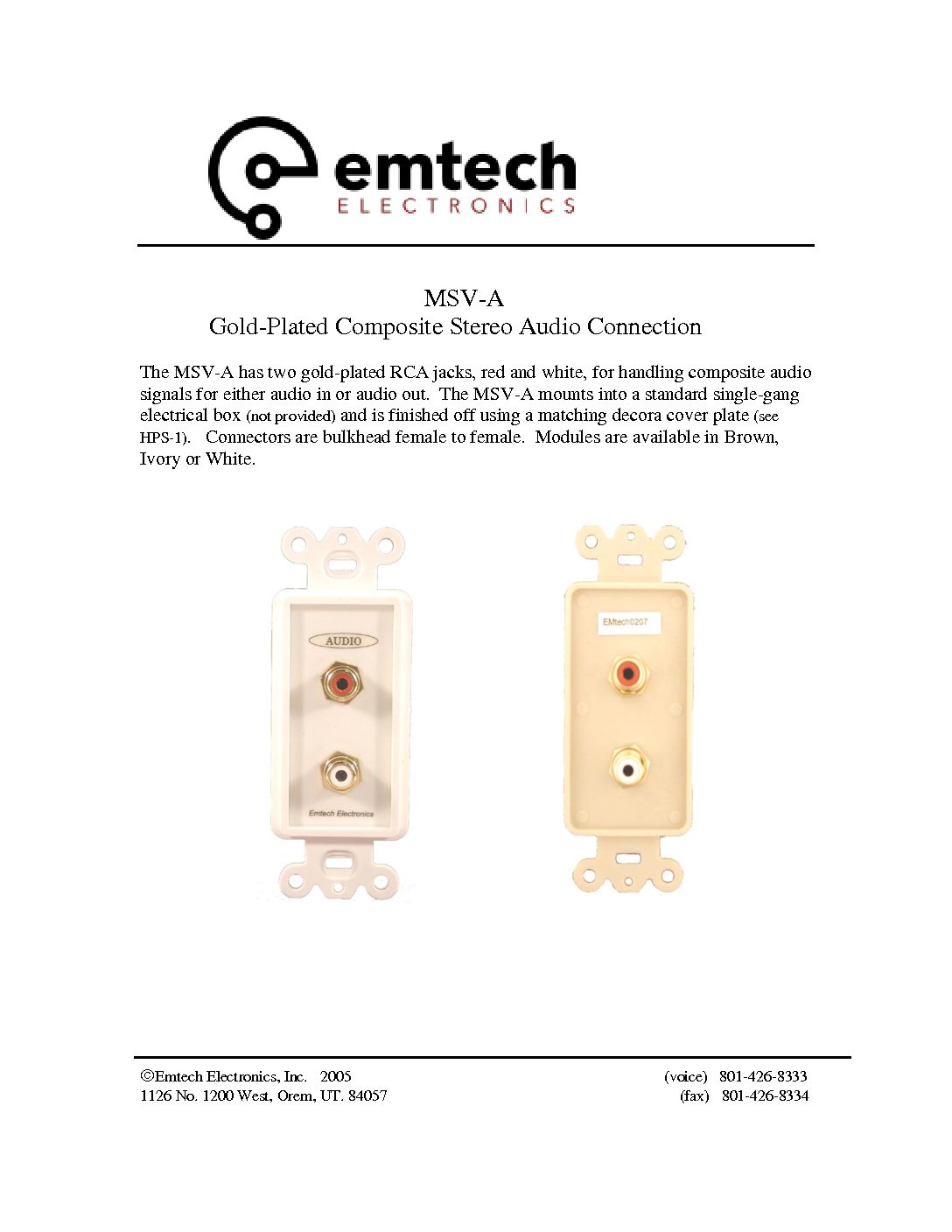 The MSV-A has two gold-plated RCA jacks, red and white, for handling composite audio signals for either audio in or audio out. The MSV-A mounts into a standard single-gang electrical box (not provided) and is finished off using a matching decora cover plate (see HPS-1). Connectors are bulkhead female to female. Modules are available in Brown, Ivory or White.