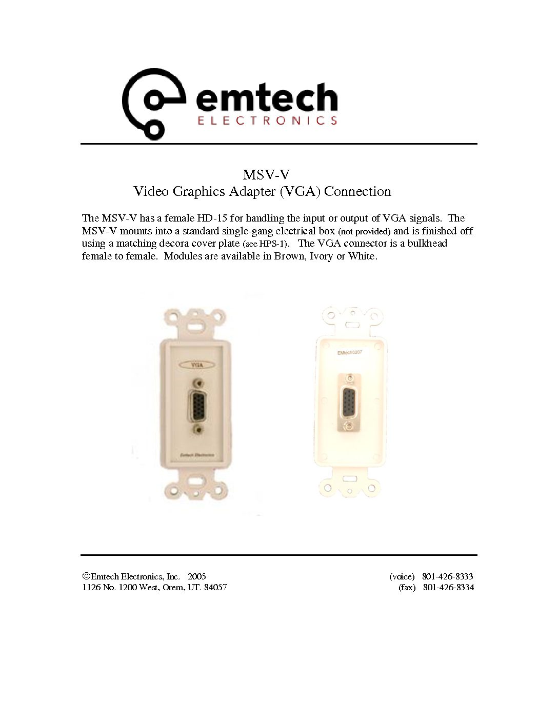 The MSV-V has a female HD-15 for handling the input or output of VGA signals. The MSV-V mounts into a standard single-gang electrical box (not provided) and is finished off using a matching decora cover plate (see HPS-1). The VGA connector is a bulkhead female to female. Modules are available in Brown, Ivory or White.