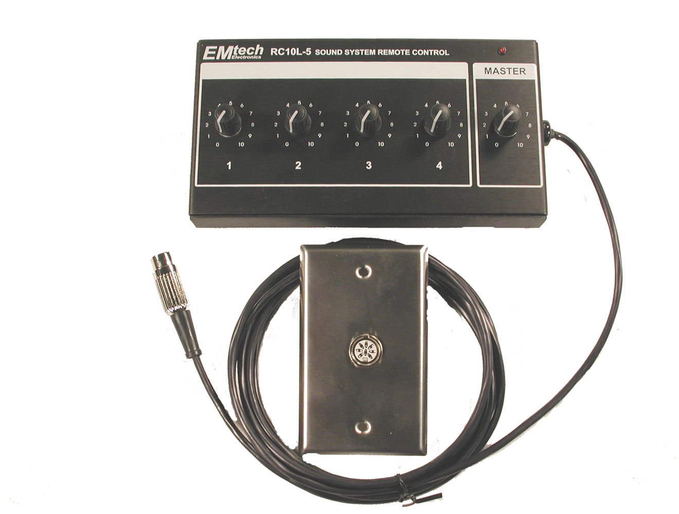 The RC10L-5 is a remote control designed to work with either Ivie or BSS Audio DSP’s and Auto mixers. It provides volume controls for four channels with a master volume control. The RC10L-5 has a 10’ cable terminated into an 8-pin male DIN connector. The mating 8-pin female DIN connector is provided mounted on a single gang stainless steel wall plate. The RC10L-5 can also be plugged into an MSC-R module.
